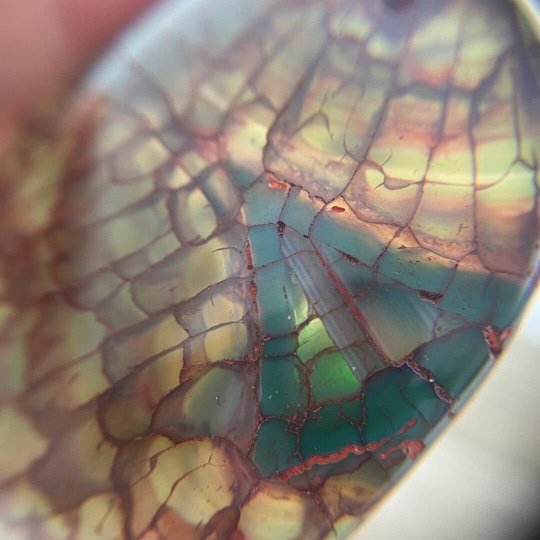 こちらのアゲートの模様は、竜の鱗の様に見えることから『ドラゴンベイン』や『ドラゴンヴェインズ』と呼ばれるクラック加工がされており、カラフルな色味は染色によるものです。