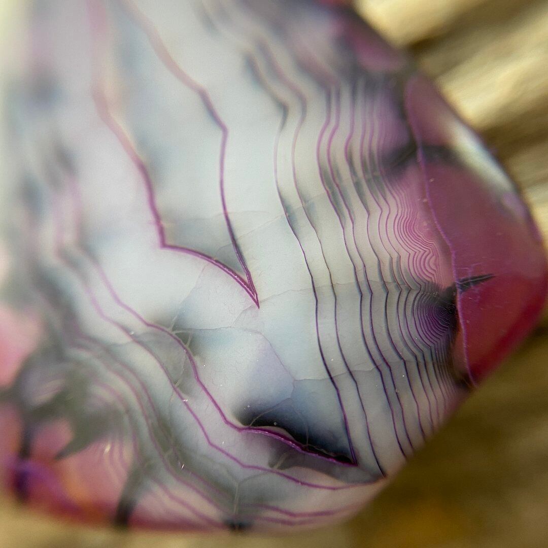 こちらのアゲートの模様は、竜の鱗の様に見えることから『ドラゴンベイン』や『ドラゴンヴェインズ』と呼ばれるクラック加工がされており、カラフルな色味は染色によるものです。