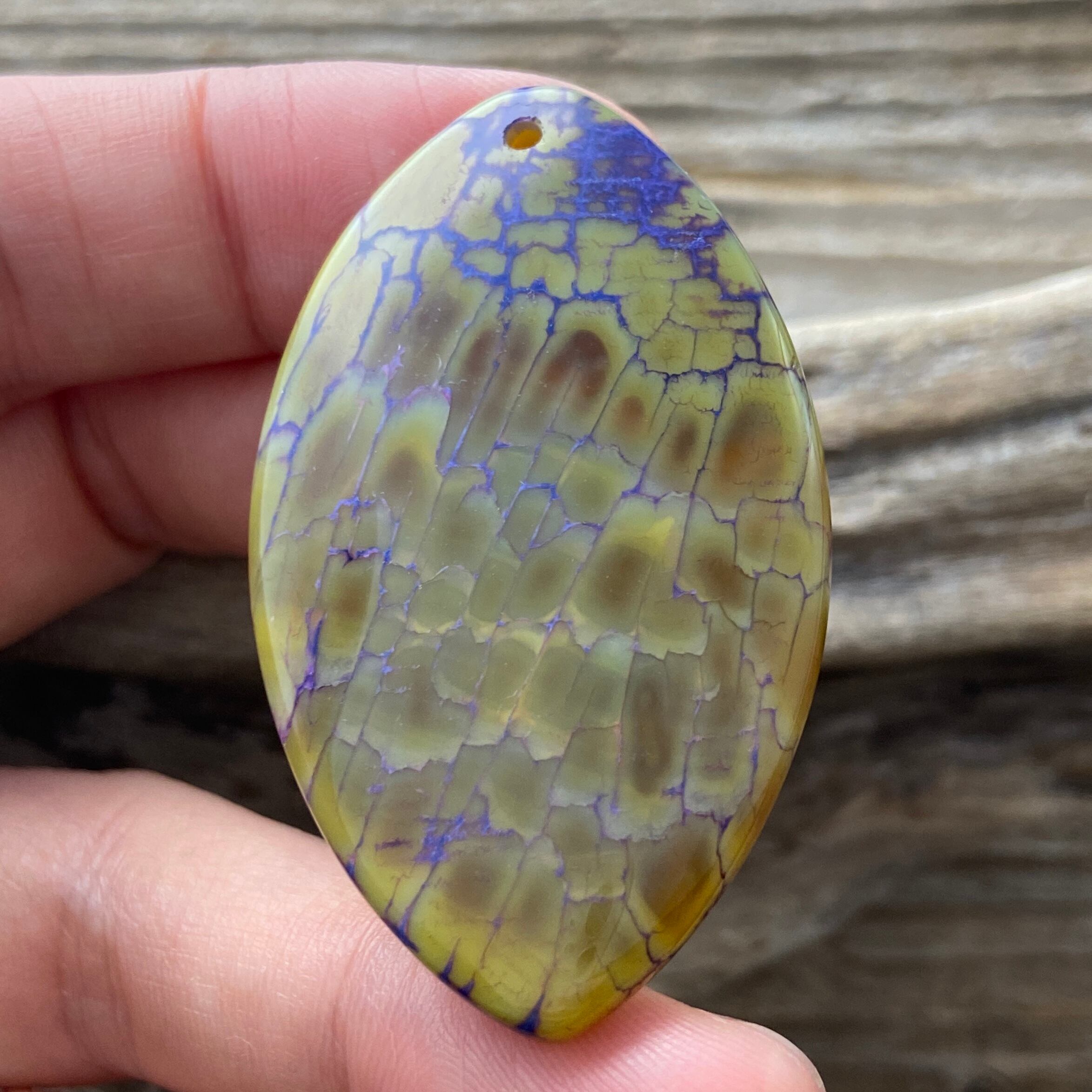 こちらのアゲートの模様は、竜の鱗の様に見えることから『ドラゴンベイン』や『ドラゴンヴェインズ』と呼ばれるクラック加工がされており、カラフルな色味は染色によるものです。