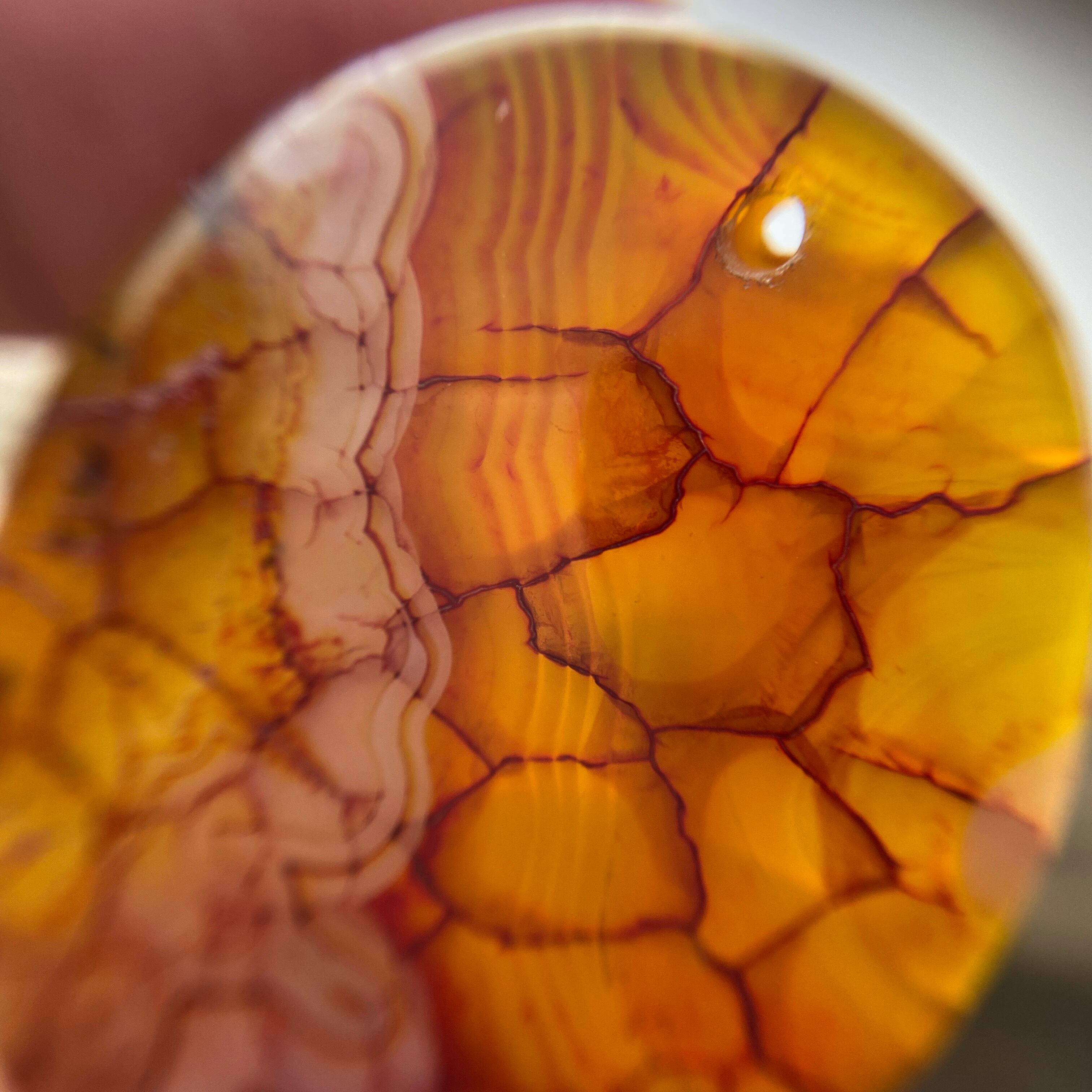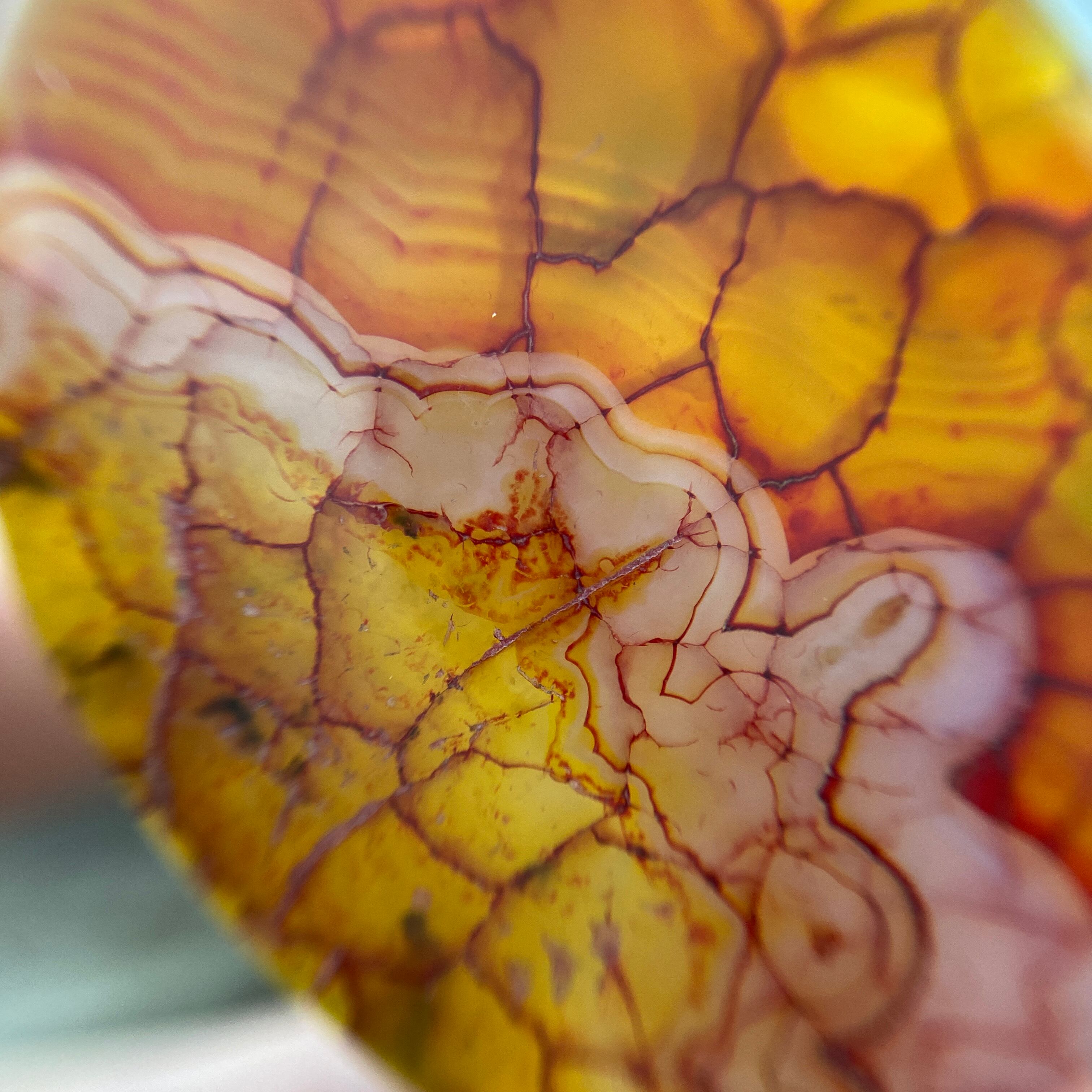 こちらのアゲートの模様は、竜の鱗の様に見えることから『ドラゴンベイン』や『ドラゴンヴェインズ』と呼ばれるクラック加工がされており、カラフルな色味は染色によるものです。