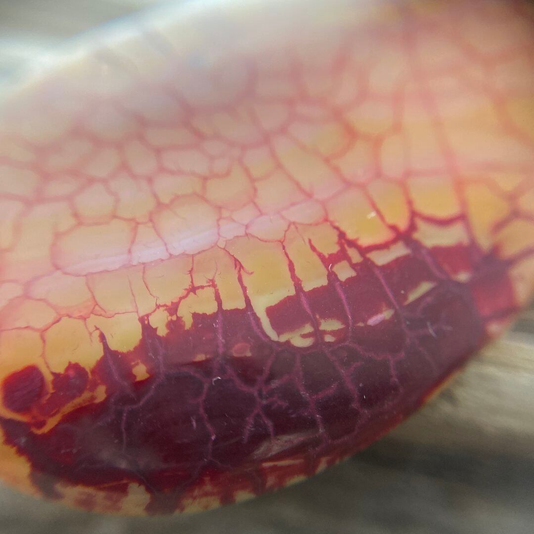 こちらのアゲートの模様は、竜の鱗の様に見えることから『ドラゴンベイン』や『ドラゴンヴェインズ』と呼ばれるクラック加工がされており、カラフルな色味は染色によるものです。
