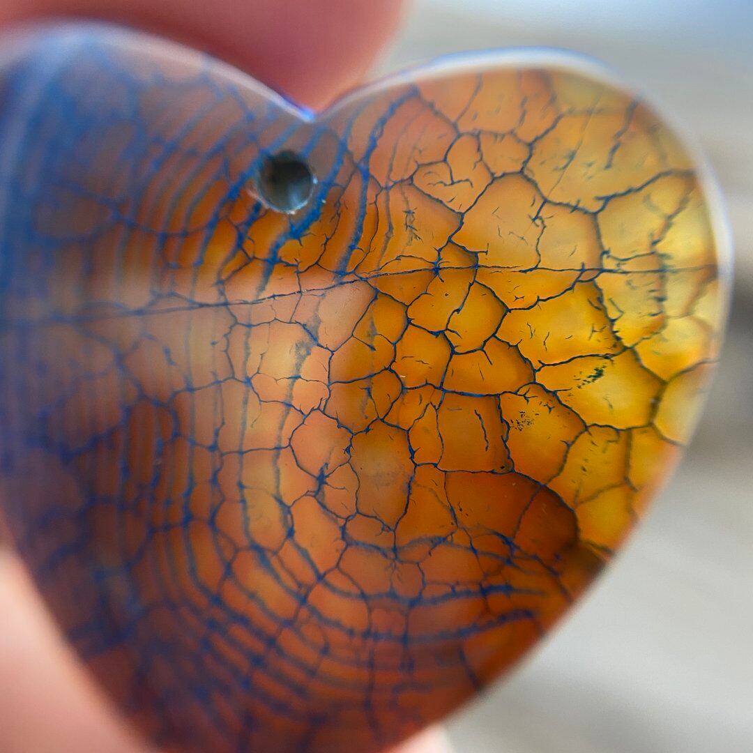こちらのアゲートの模様は、竜の鱗の様に見えることから『ドラゴンベイン』や『ドラゴンヴェインズ』と呼ばれるクラック加工がされており、カラフルな色味は染色によるものです。