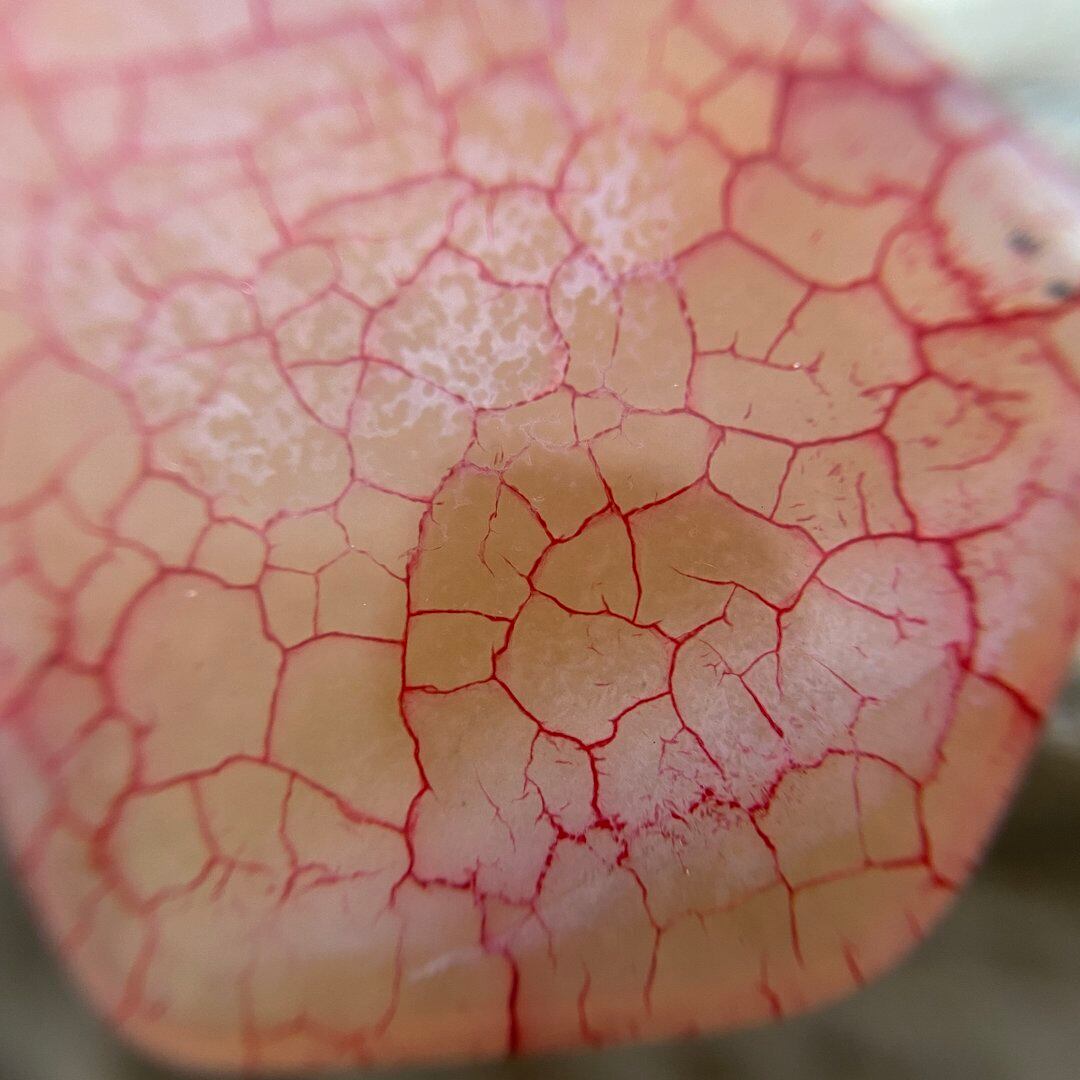 こちらのアゲートの模様は、竜の鱗の様に見えることから『ドラゴンベイン』や『ドラゴンヴェインズ』と呼ばれるクラック加工がされており、カラフルな色味は染色によるものです。