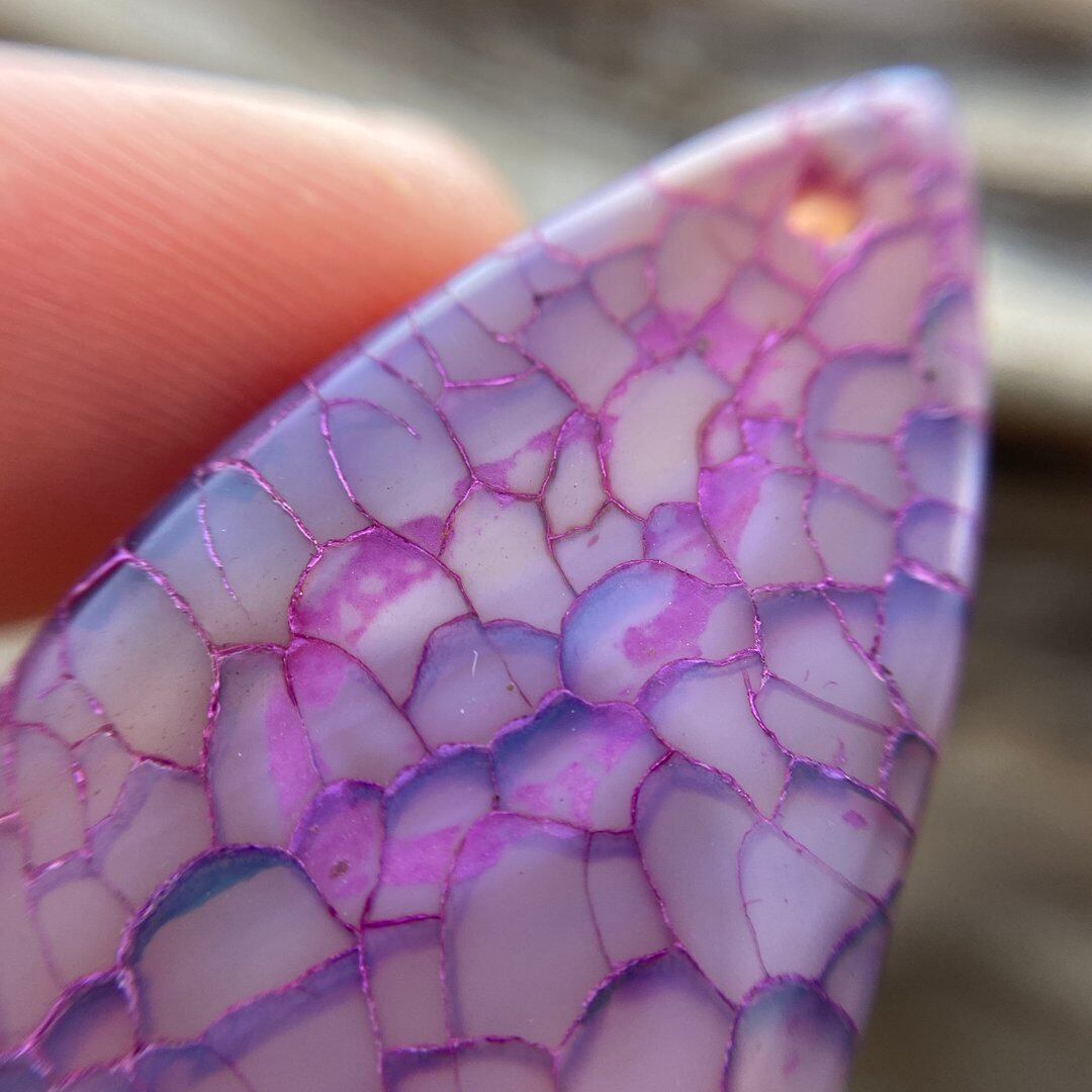 こちらのアゲートの模様は、竜の鱗の様に見えることから『ドラゴンベイン』や『ドラゴンヴェインズ』と呼ばれるクラック加工がされており、カラフルな色味は染色によるものです。