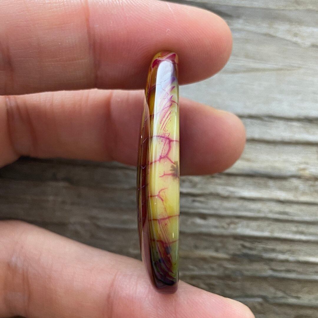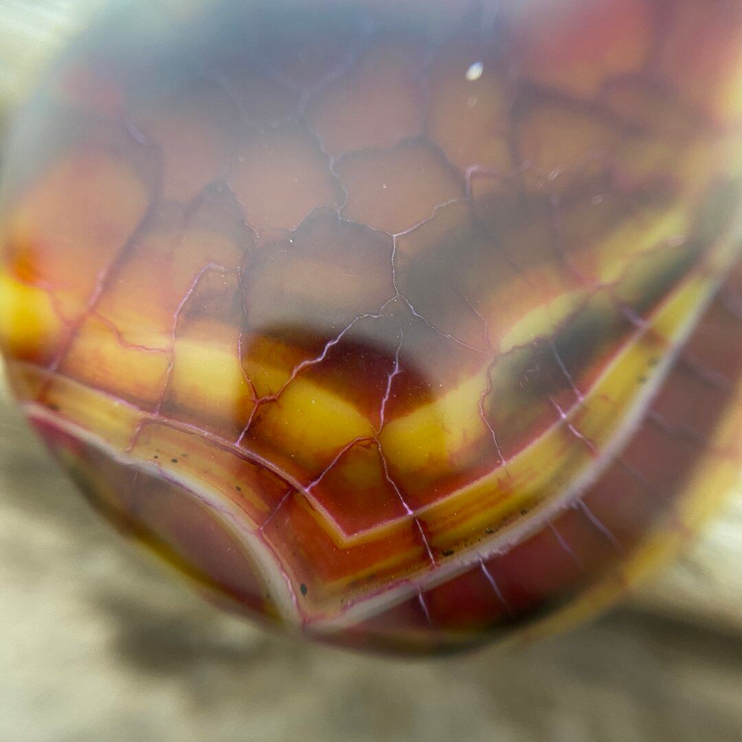 こちらのアゲートの模様は、竜の鱗の様に見えることから『ドラゴンベイン』や『ドラゴンヴェインズ』と呼ばれるクラック加工がされており、カラフルな色味は染色によるものです。