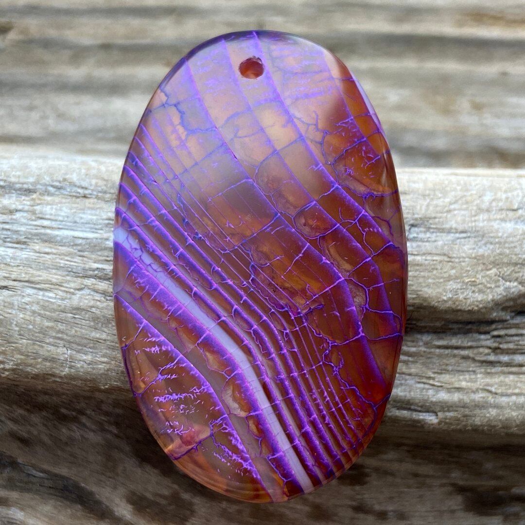 こちらのアゲートの模様は、竜の鱗の様に見えることから『ドラゴンベイン』や『ドラゴンヴェインズ』と呼ばれるクラック加工がされており、カラフルな色味は染色によるものです。