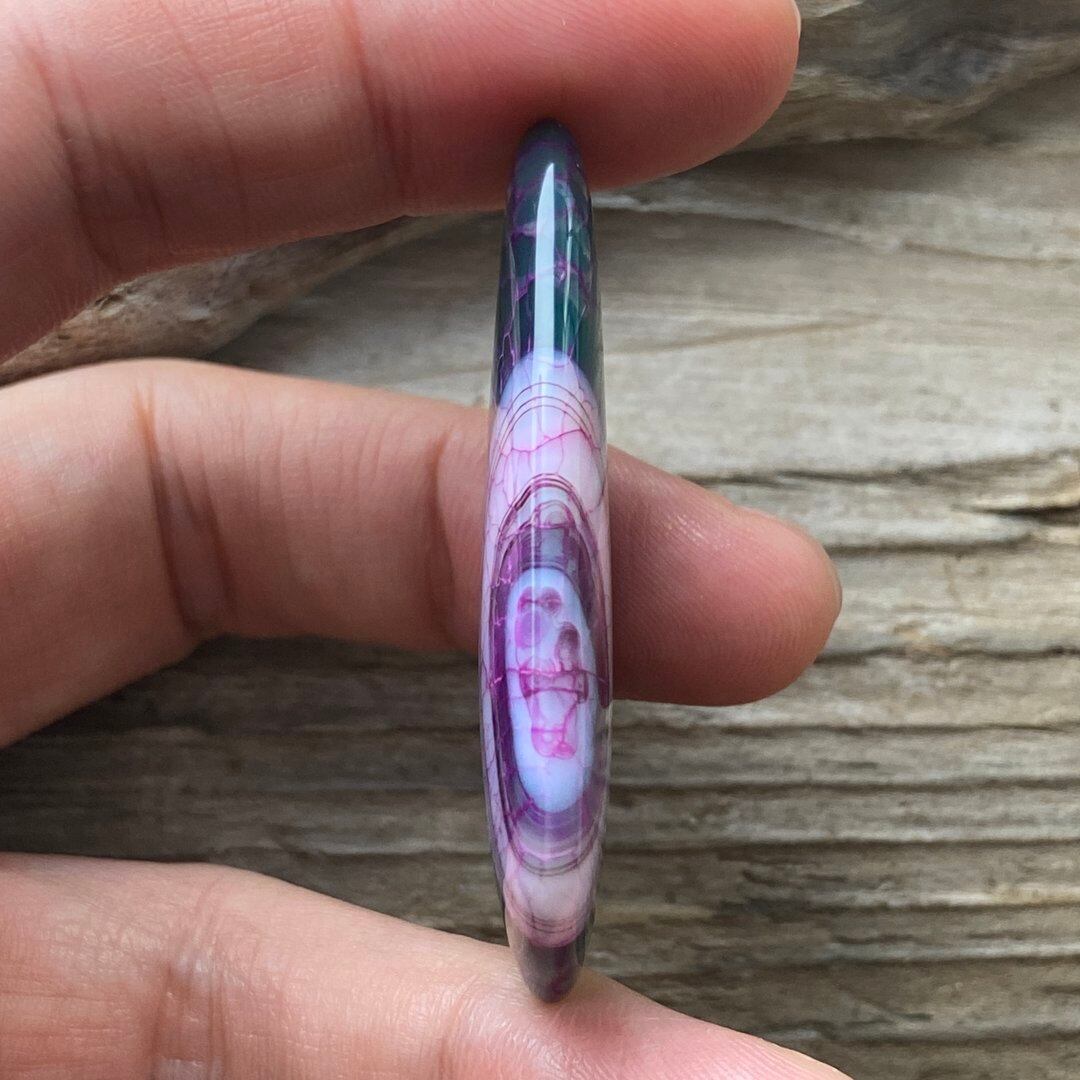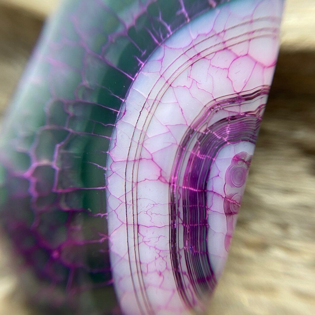 こちらのアゲートの模様は、竜の鱗の様に見えることから『ドラゴンベイン』や『ドラゴンヴェインズ』と呼ばれるクラック加工がされており、カラフルな色味は染色によるものです。