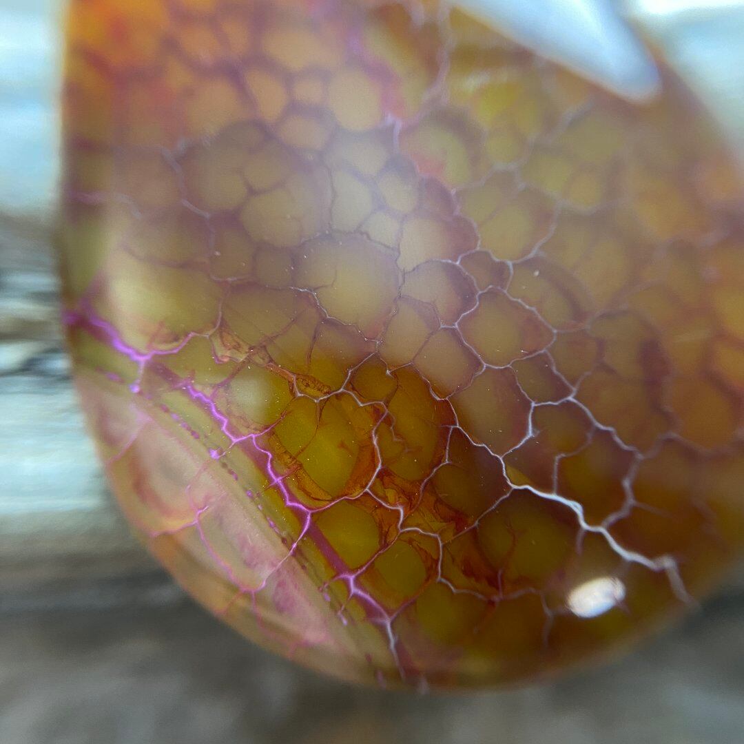 こちらのアゲートの模様は、竜の鱗の様に見えることから『ドラゴンベイン』や『ドラゴンヴェインズ』と呼ばれるクラック加工がされており、カラフルな色味は染色によるものです。