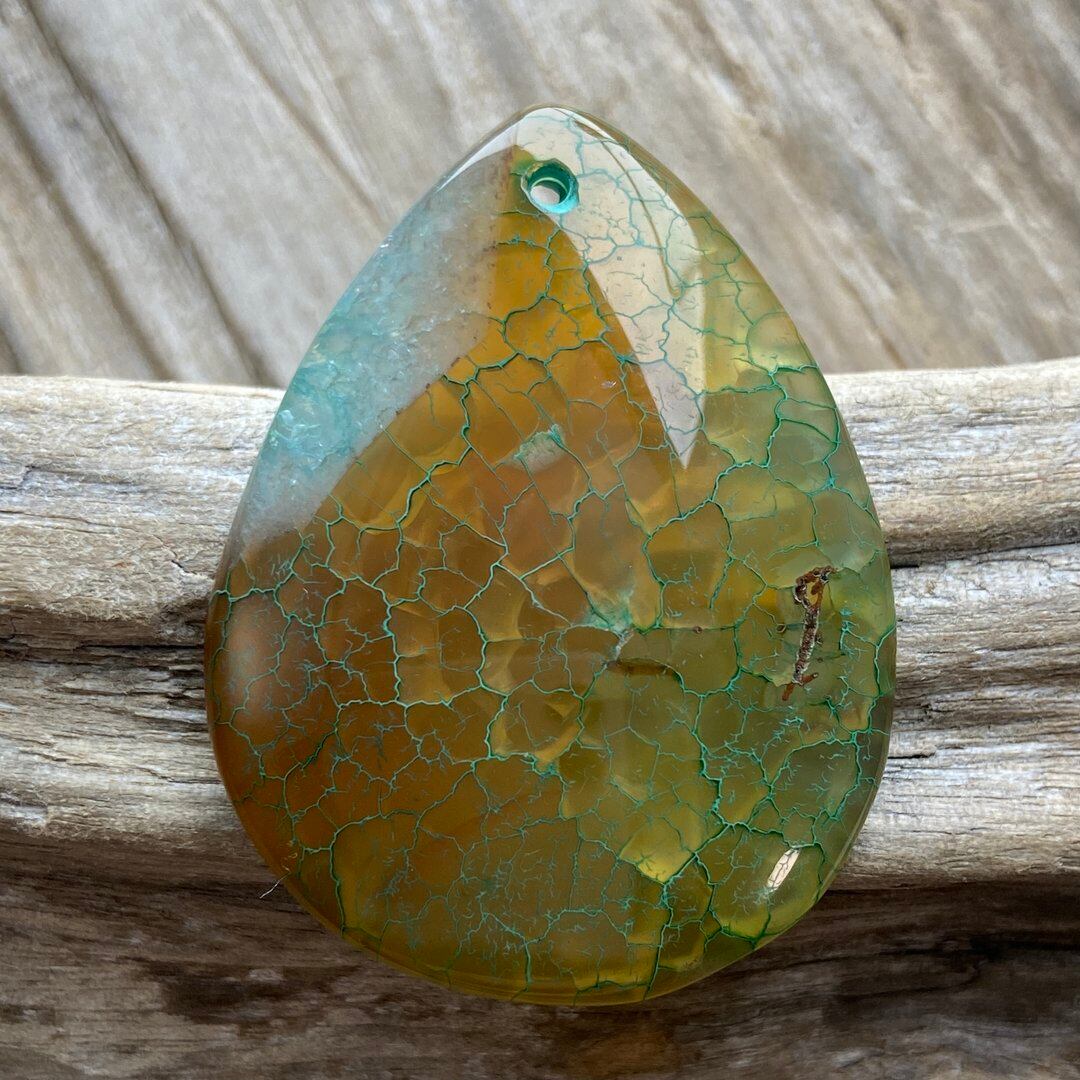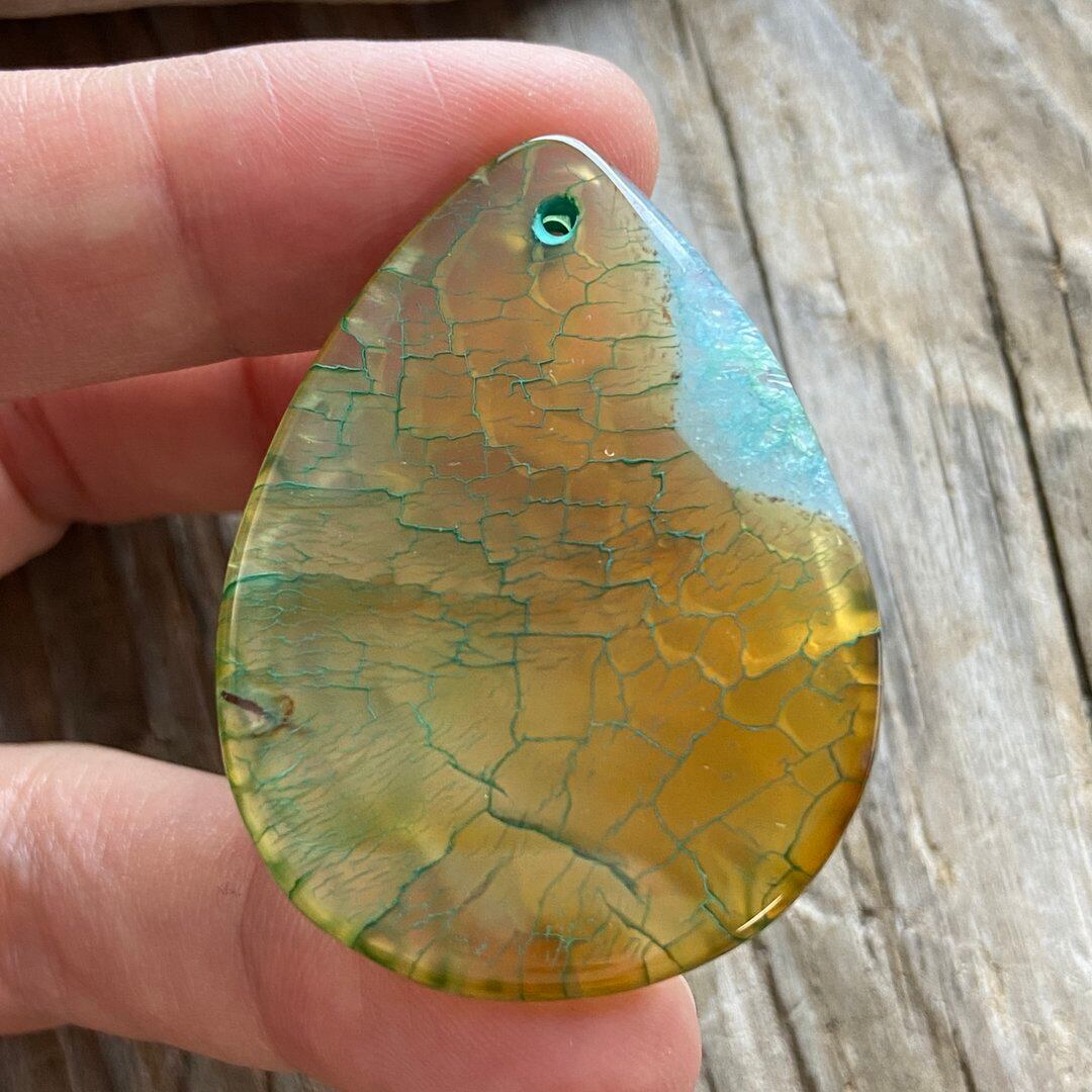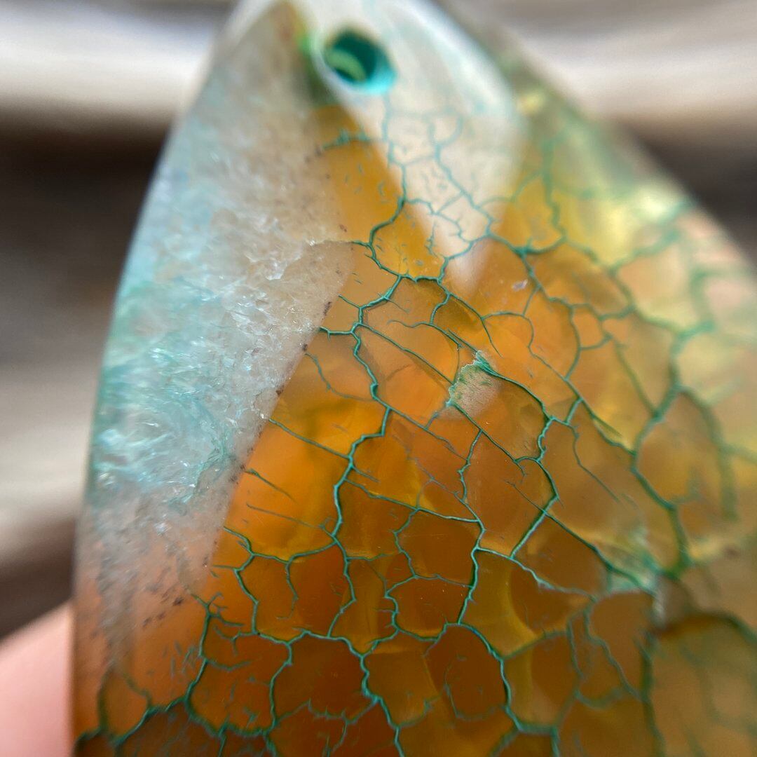 こちらのアゲートの模様は、竜の鱗の様に見えることから『ドラゴンベイン』や『ドラゴンヴェインズ』と呼ばれるクラック加工がされており、カラフルな色味は染色によるものです。