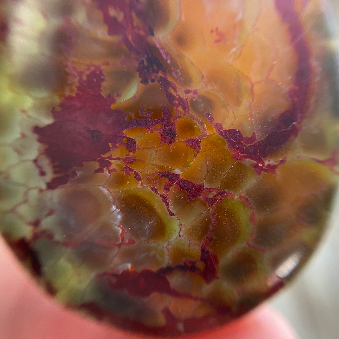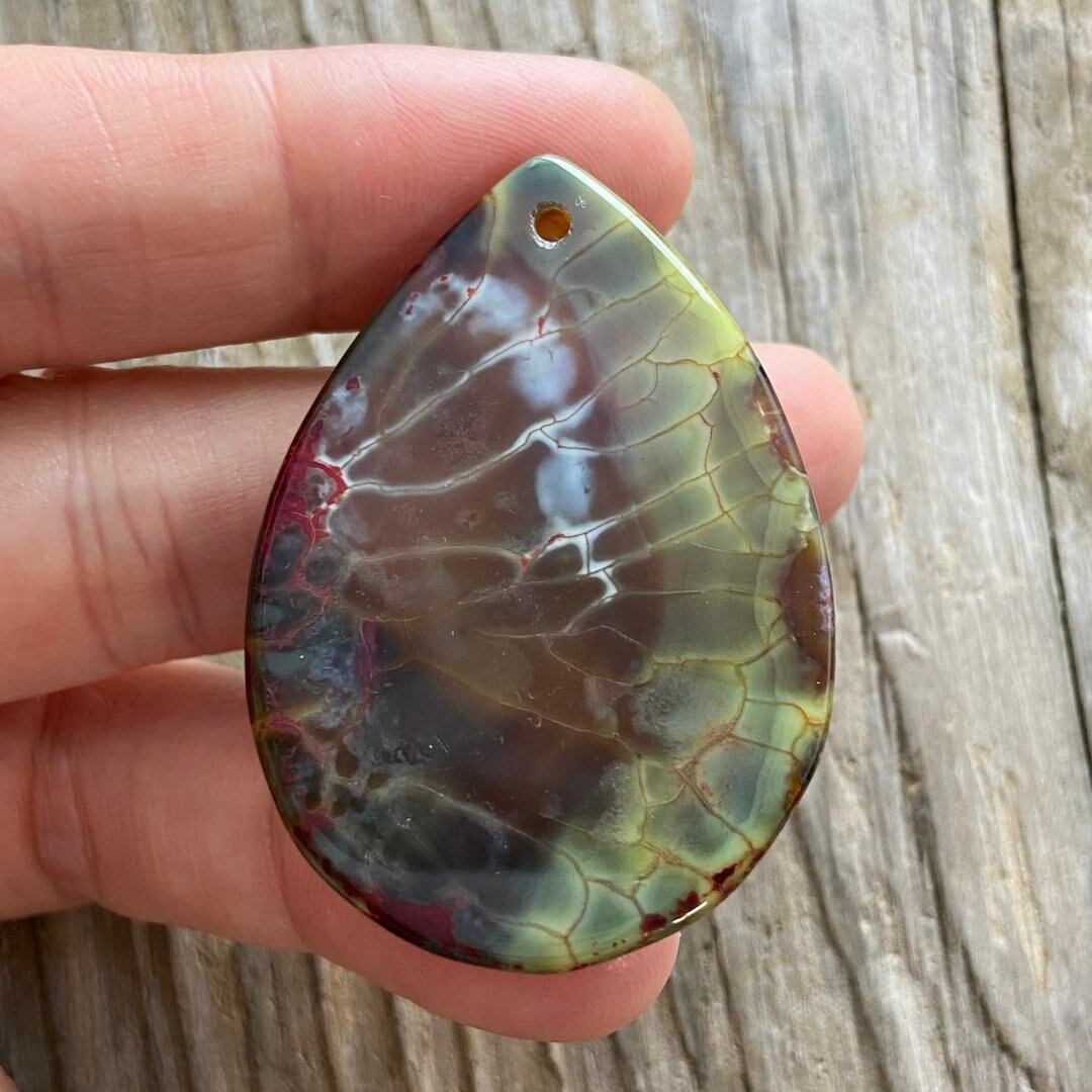 こちらのアゲートの模様は、竜の鱗の様に見えることから『ドラゴンベイン』や『ドラゴンヴェインズ』と呼ばれるクラック加工がされており、カラフルな色味は染色によるものです。