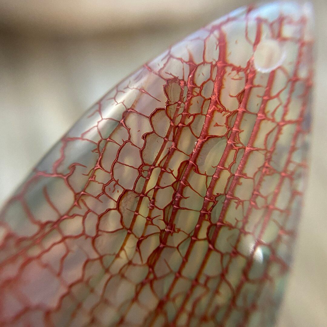 こちらのアゲートの模様は、竜の鱗の様に見えることから『ドラゴンベイン』や『ドラゴンヴェインズ』と呼ばれるクラック加工がされており、カラフルな色味は染色によるものです。