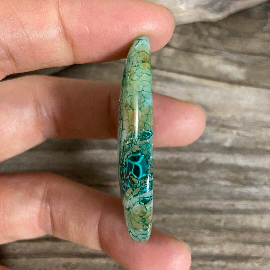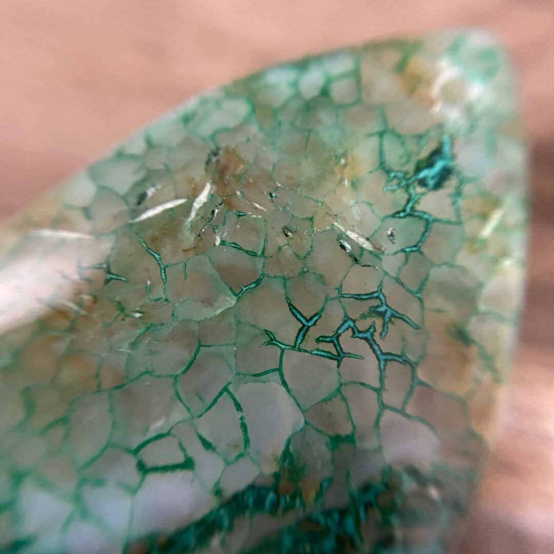 こちらのアゲートの模様は、竜の鱗の様に見えることから『ドラゴンベイン』や『ドラゴンヴェインズ』と呼ばれるクラック加工がされており、カラフルな色味は染色によるものです。