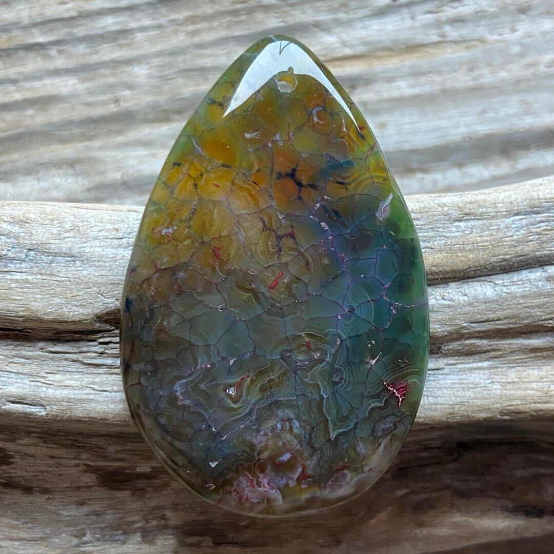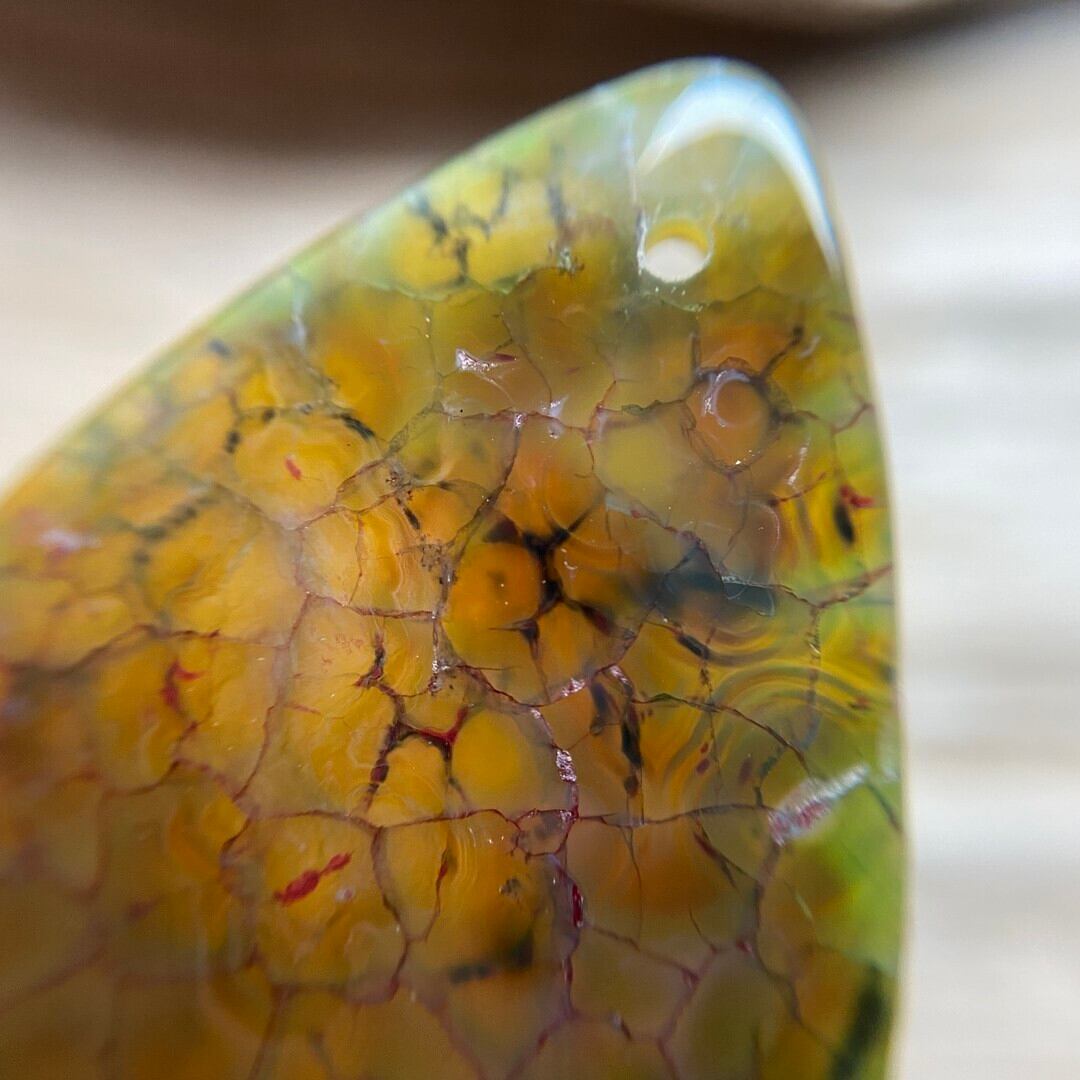 こちらのアゲートの模様は、竜の鱗の様に見えることから『ドラゴンベイン』や『ドラゴンヴェインズ』と呼ばれるクラック加工がされており、カラフルな色味は染色によるものです。