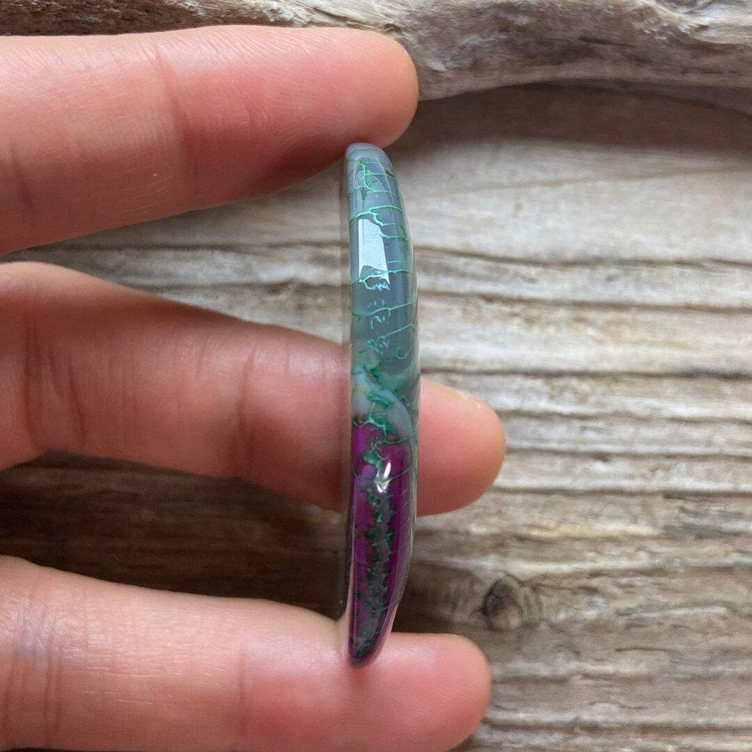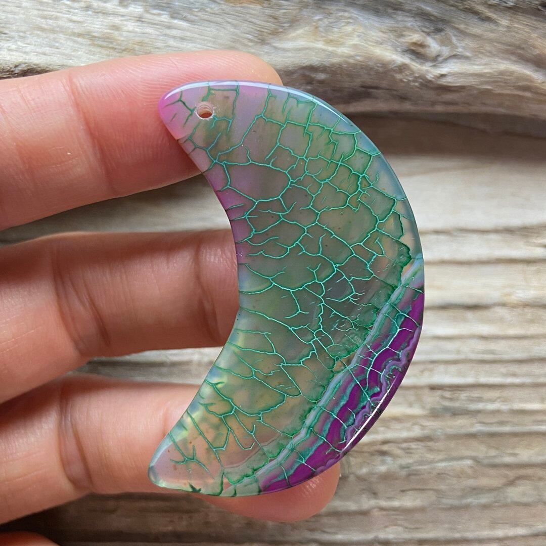 こちらのアゲートの模様は、竜の鱗の様に見えることから『ドラゴンベイン』や『ドラゴンヴェインズ』と呼ばれるクラック加工がされており、カラフルな色味は染色によるものです。