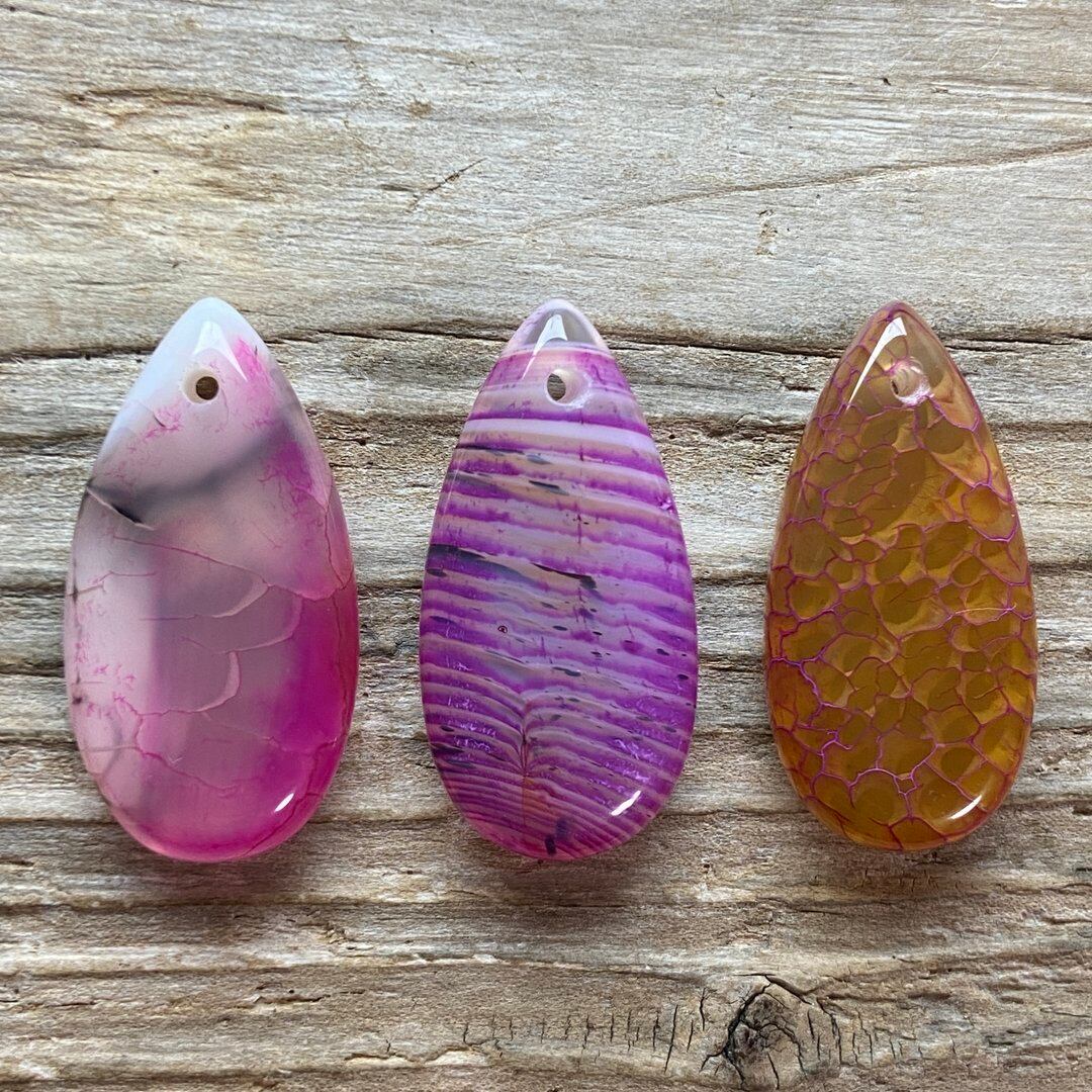 こちらのアゲートの模様は、竜の鱗の様に見えることから『ドラゴンベイン』や『ドラゴンヴェインズ』と呼ばれるクラック加工がされており、カラフルな色味は染色によるものです。