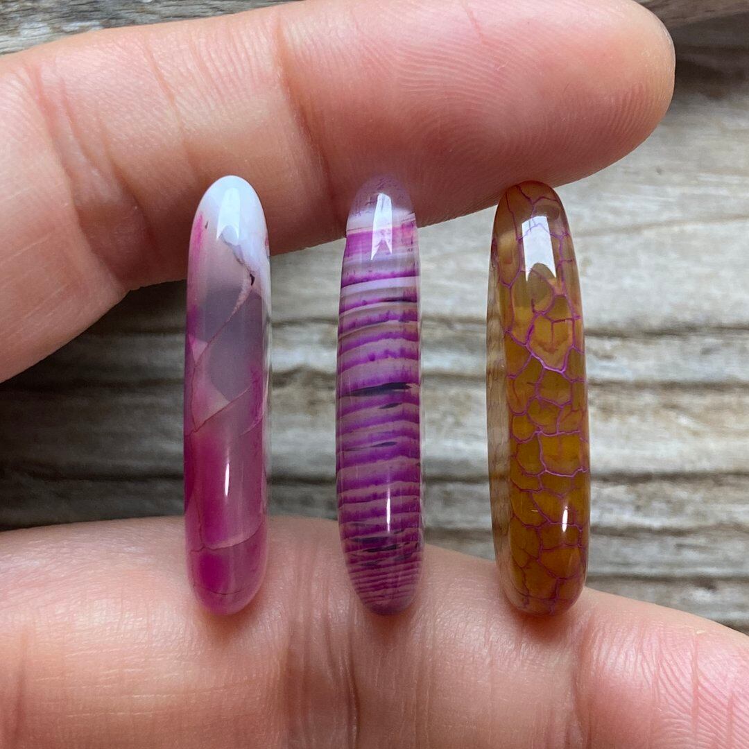 また天然アゲートならではの、ドゥルージー部分、美しい曲線を描くライン、ストライプ模様などを生かしたデザインは多彩で、同じ模様の石はありません。