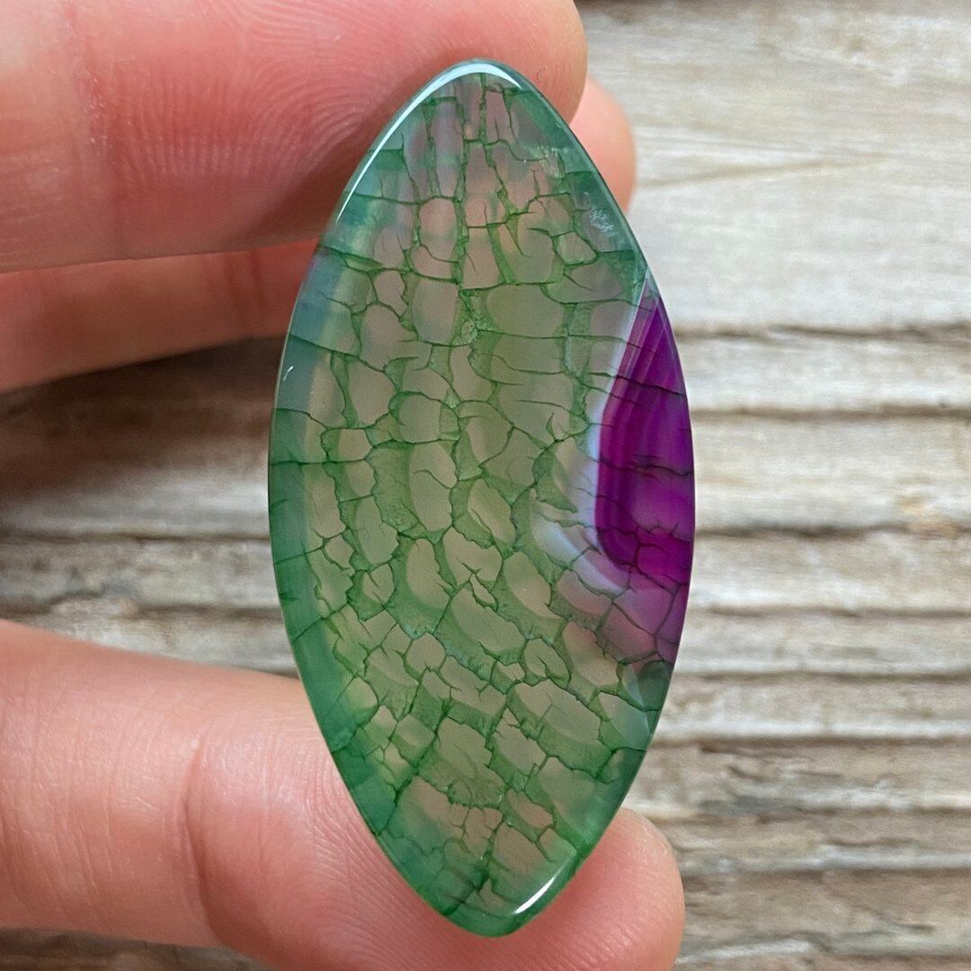 こちらのアゲートの模様は、竜の鱗の様に見えることから『ドラゴンベイン』や『ドラゴンヴェインズ』と呼ばれるクラック加工がされており、カラフルな色味は染色によるものです。