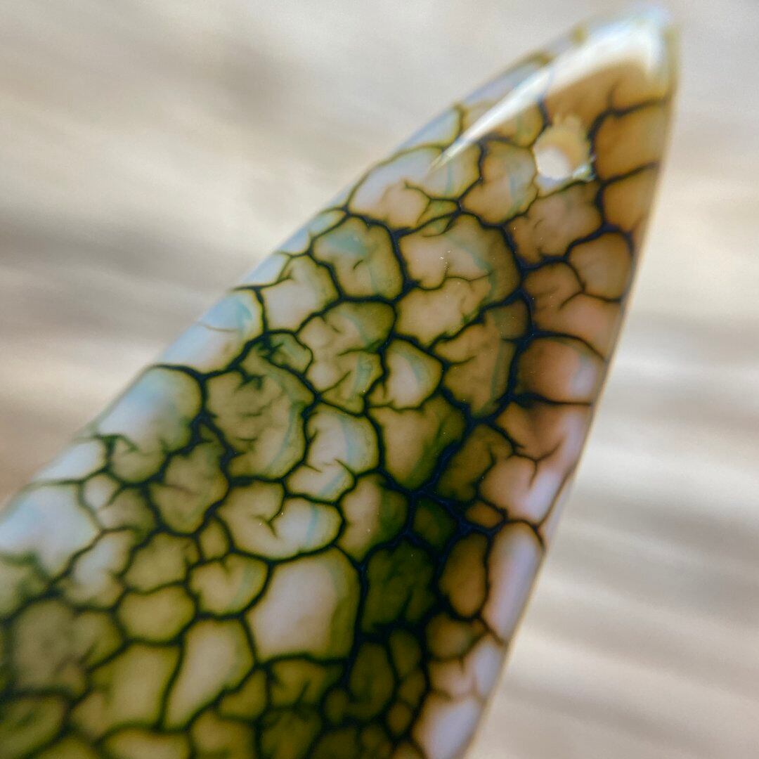 こちらのアゲートの模様は、竜の鱗の様に見えることから『ドラゴンベイン』や『ドラゴンヴェインズ』と呼ばれるクラック加工がされており、カラフルな色味は染色によるものです。