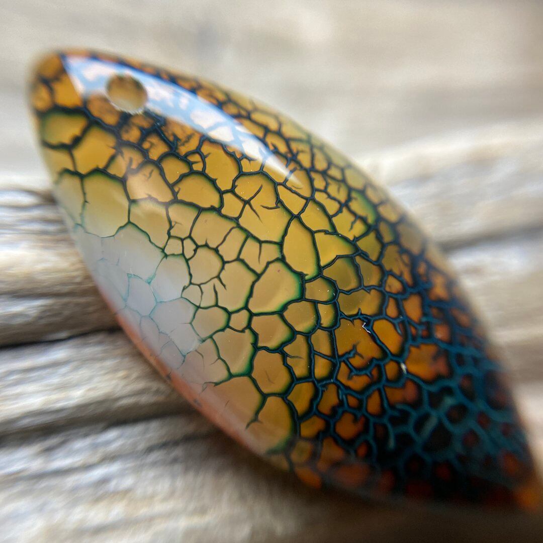 こちらのアゲートの模様は、竜の鱗の様に見えることから『ドラゴンベイン』や『ドラゴンヴェインズ』と呼ばれるクラック加工がされており、カラフルな色味は染色によるものです。