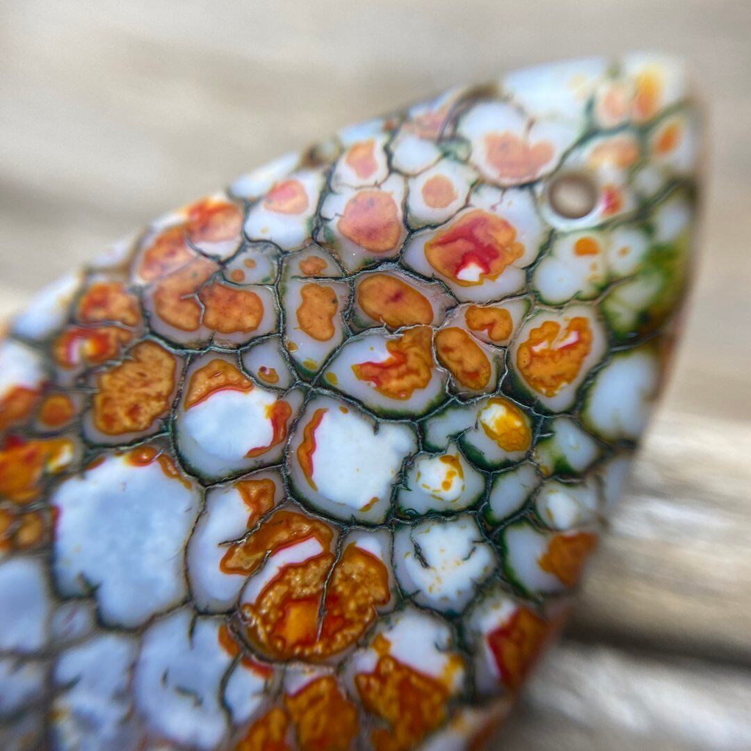 こちらのアゲートの模様は、竜の鱗の様に見えることから『ドラゴンベイン』や『ドラゴンヴェインズ』と呼ばれるクラック加工がされており、カラフルな色味は染色によるものです。