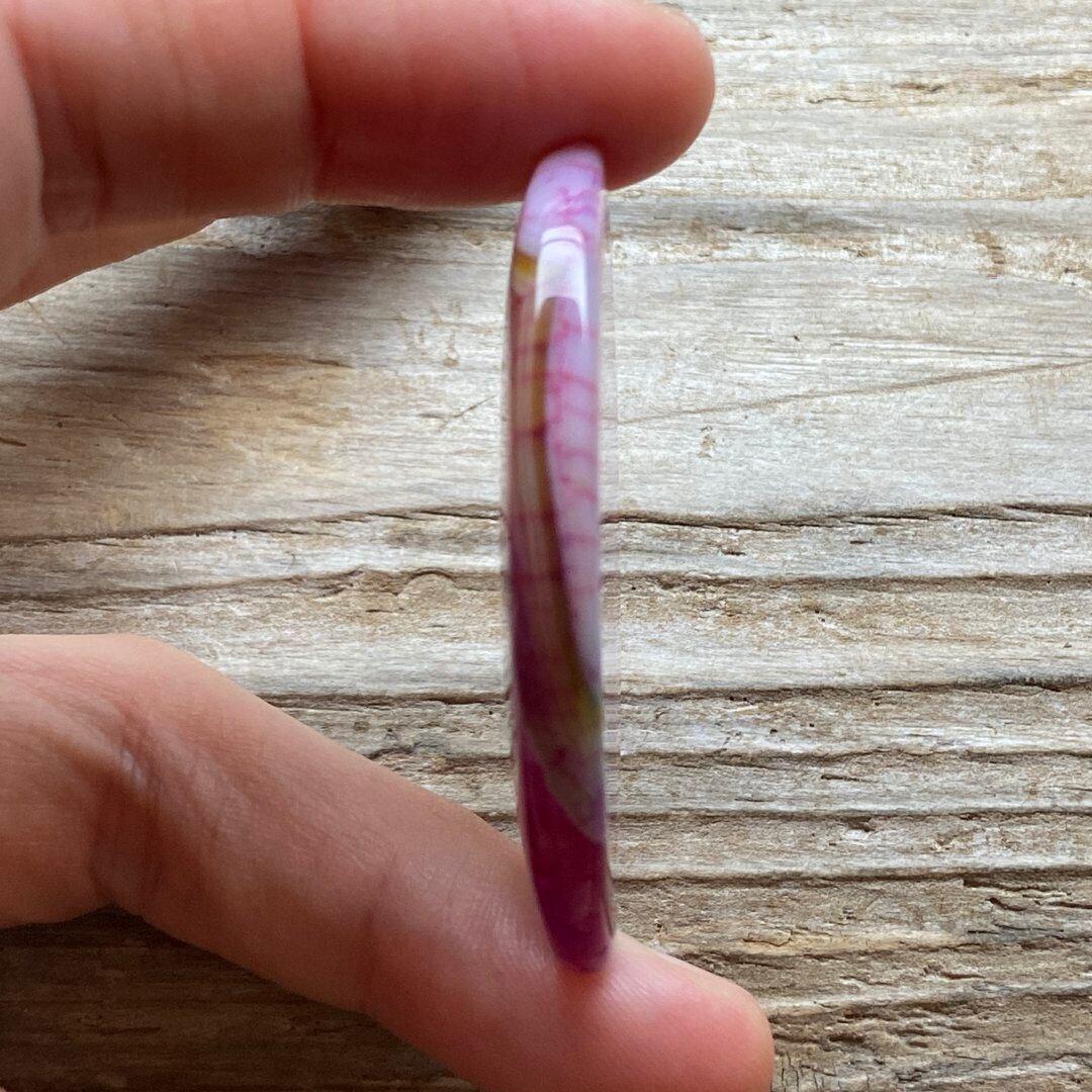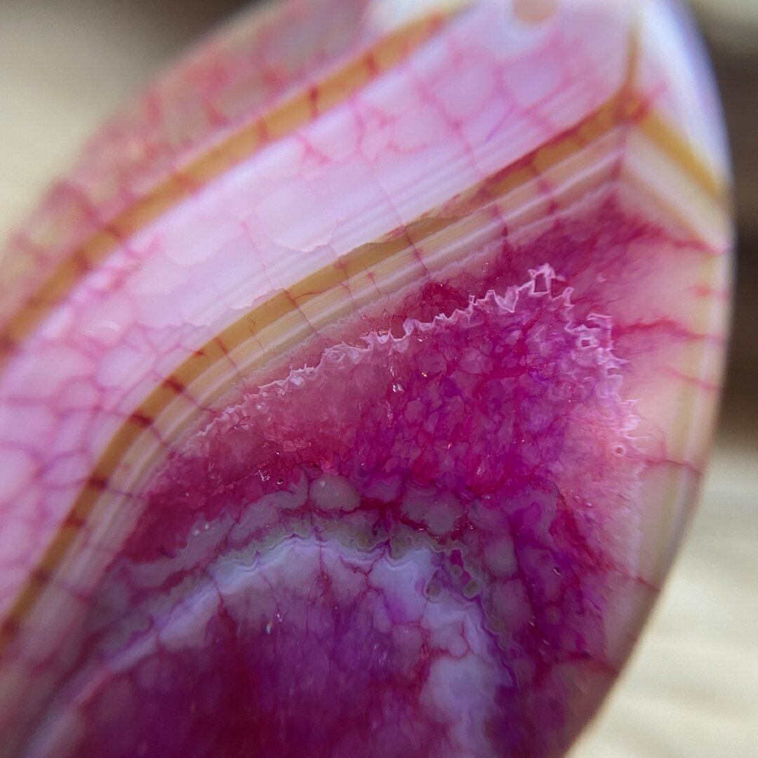 こちらのアゲートの模様は、竜の鱗の様に見えることから『ドラゴンベイン』や『ドラゴンヴェインズ』と呼ばれるクラック加工がされており、カラフルな色味は染色によるものです。